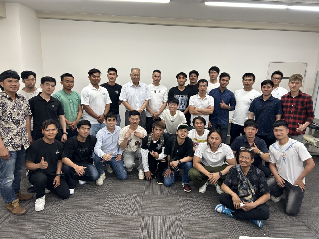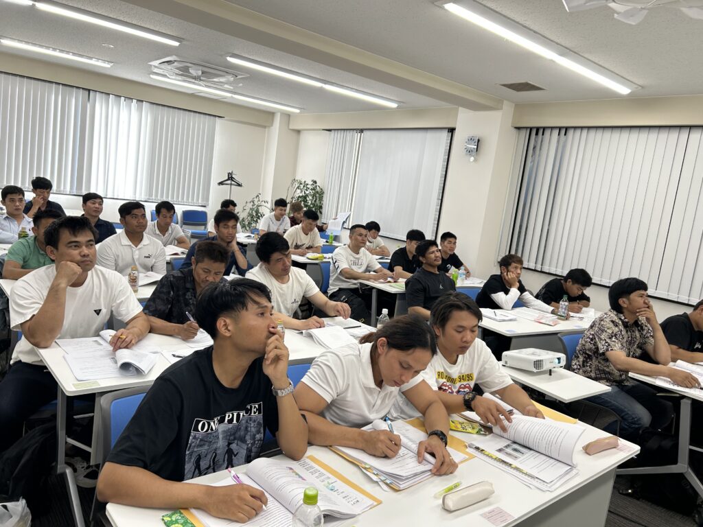 お昼休憩後、授業の開始です。座席は出身国ごとに固めて、違う会社、違う業種でもみんなで助け合っています。「眠くなってしまうけど頑張ってね!」と声をかけると、全員が元気よく「ハイ!!」とお返事。こちらも元気をもらいました!