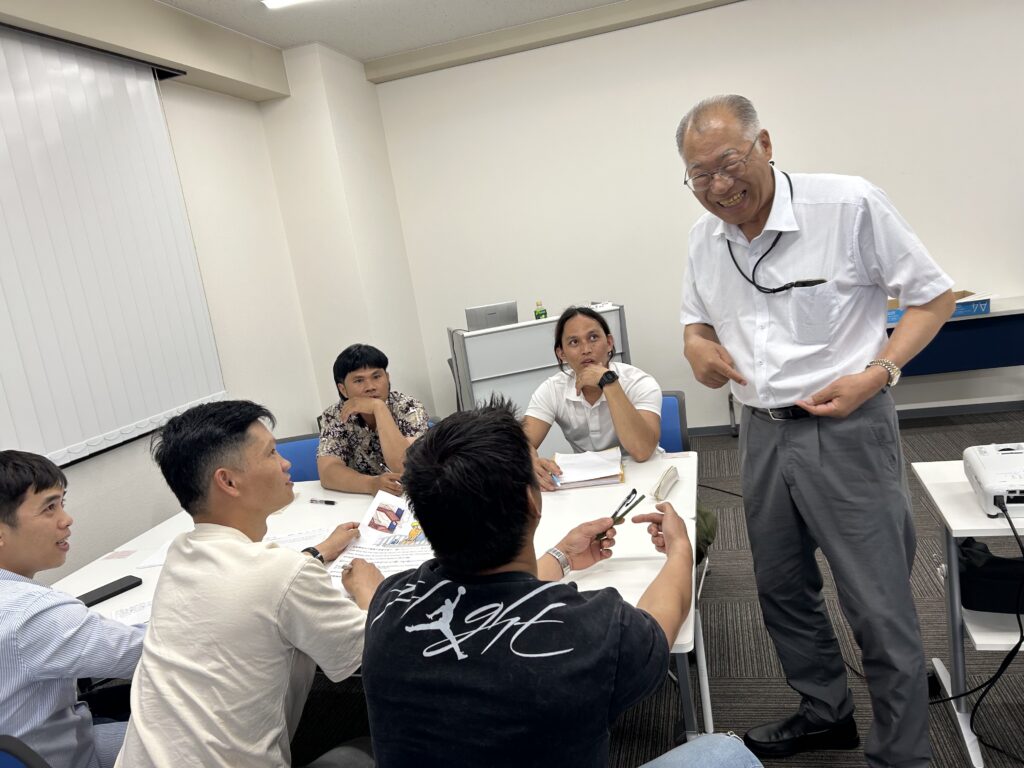 危険予知のグループ演習は、毎回とても田中先生が重視なさる時間。写真をみて、どこに危険が潜んでいるかを、日本語で書き出し、発表します。考える、言葉にする、文字で書く、外国人の皆さんにとっては難関ですが、リーダーとなるには、とても重要なスキルです。