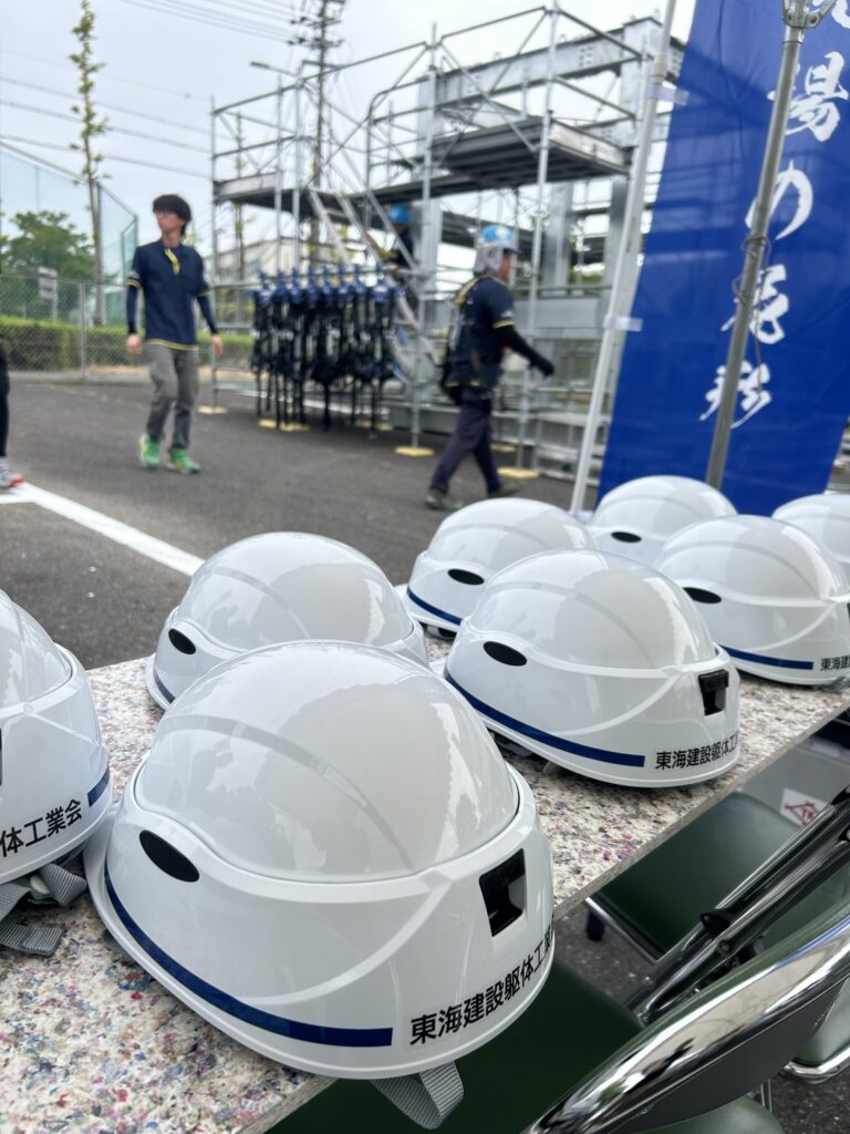 初日はとても涼しいスタート。ブースの準備に朝早くから所属企業様よりたくさんのご協力をいただきました。とびブースでは青空のもと、フルハーネスの着用や足場を組む体験が用意されています。ピカピカのヘルメットでお迎えします!