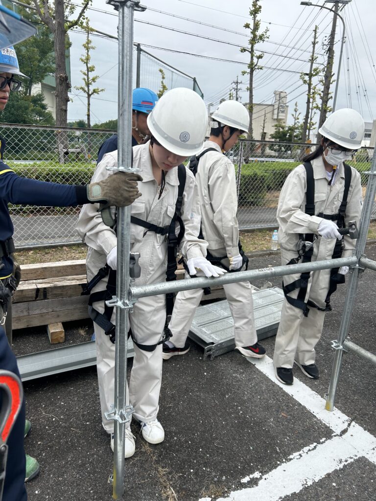 フルハーネスを着用し、足場の組立て体験!今回もたくさんの学生さんたちにご参加いただきました。