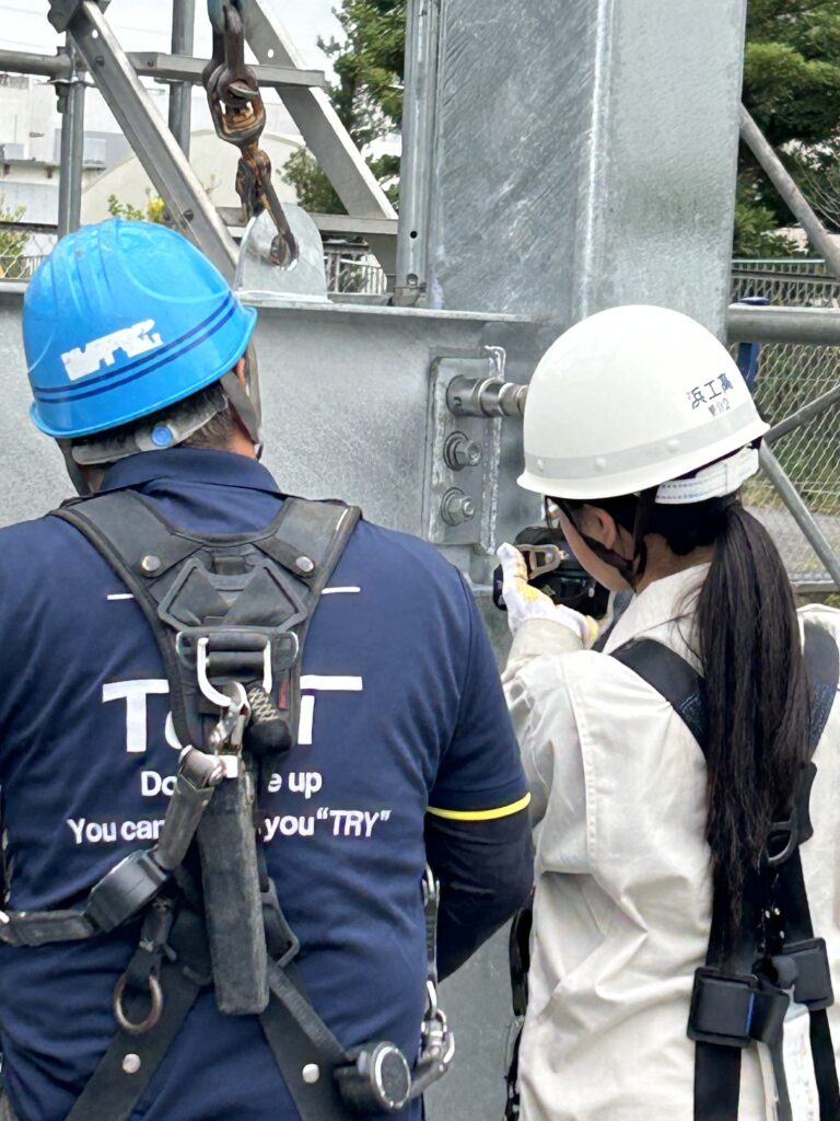 講師の方々の説明を真剣に聞いてくださる学生さんたち。装着したフルハーネスだけでも重いのに、職人さんたちの腰道具は10キロ以上にもなると聞いて、びっくりしたお顔も^^
