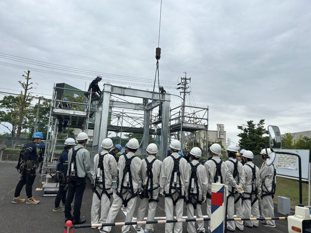 学生さんたちも真剣な眼差し!玉掛による鉄骨組立てのデモンストレーション