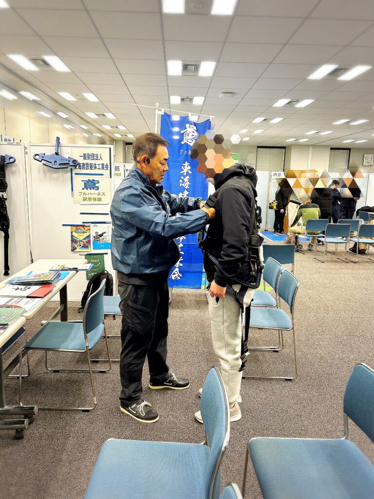 建設業振興基金様からのオファーをいただき、東海躯体もブース出展しました。フルハーネス安全帯の試着体験と、会員企業様の紹介がメインの催し、興味を持たれた求職者に鳶土工の仕事の魅力をお伝えしました。